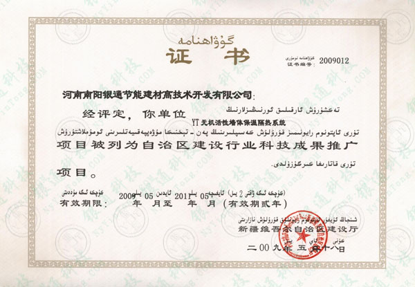 河南南陽銀通節能建材高技術開發有限公司:經評定,你單位YT無機活性墻體保溫隔熱系統項目被列為自治區建設行業科技成果推廣項目。有效期兩年。