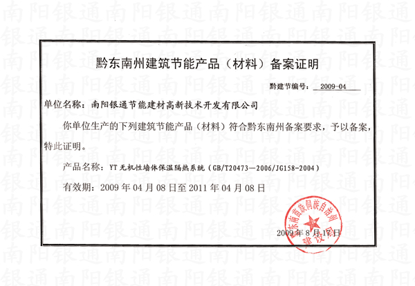 黔東南州建筑節能產品(材料)備案證明 黔建節編號:2009-04 單位名稱:南陽銀通節能建材高新技術開發有限公司 你單位生產的下列建筑節能產品(材料)符合 黔東南州備案要求,予以備案,特此證明。 產品名稱:YT無機活性墻體保溫隔熱材料(GB/T20473-2006/JG158-2004) 有效期:2009年04月08日至2011年04月08日 黔東南苗族侗族自治州 2009年8月17日 黔東南州建筑節能產品(材料)備案證明南陽銀通
