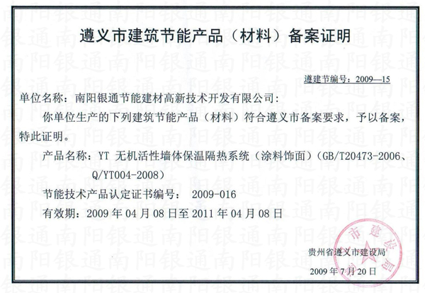 遵義市建筑節能產品(材料)備案證明 遵建節編號:2009-15 單位名稱:南陽銀通節能建材高新技術開發有效公司 你單位生產的下列建筑節能產品(材料)符合遵義市備案要求,予以備案,特此證明。 產品名稱:YT無機活性墻體保溫隔熱系統(涂料飾面)(GB/T20473-2006、Q/YT004-2008) 節能技術產品認定證書編號:2009-016 有效期:2009年04月08日至2011年04月08日 貴州省遵義市建設局 2009年7月20日 遵義市建筑節能產品(材料)備案證明南陽銀通