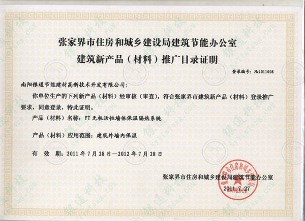 張家界市住房和城鄉建設局建筑節能辦公室建筑新產品(材料)推廣目錄證明 登錄編號:No.2011008 南陽銀通節能建材高新技術開發有限公司:你單位生產的下列新產品(材料)經審核(審查),符合張家界市建筑新產品(材料)登錄推廣要求,同意登錄,特此證 明。 產品(材料)名稱:YT無機活性墻體保溫隔熱系統 產品(材料)應用范圍:建筑外墻內保溫 有效期:2011年7月28日——2012年7月28日 張家界市住房和城鄉建設局節能辦公室 2011.7.27