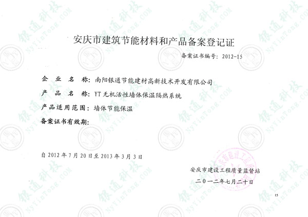 安慶市建筑節能材料和產品備案登記證 備案證書編號:2012-15 企業名稱:南陽銀通節能建材高新技術開發有限公司 產品名稱:YT無機活性墻體保溫隔熱系統 產品適用范圍:墻體節能保溫 備案證書有效期:自2012年7月20日至2013年3月3日 安慶市建設工程質量監督站 二〇一二年七月二十日