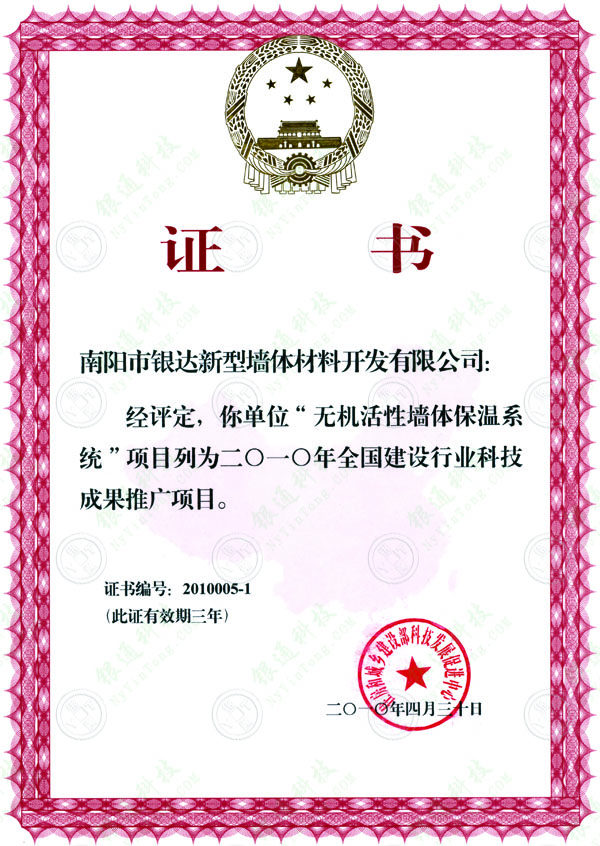2010全國建設行業科技成果推廣項目證書