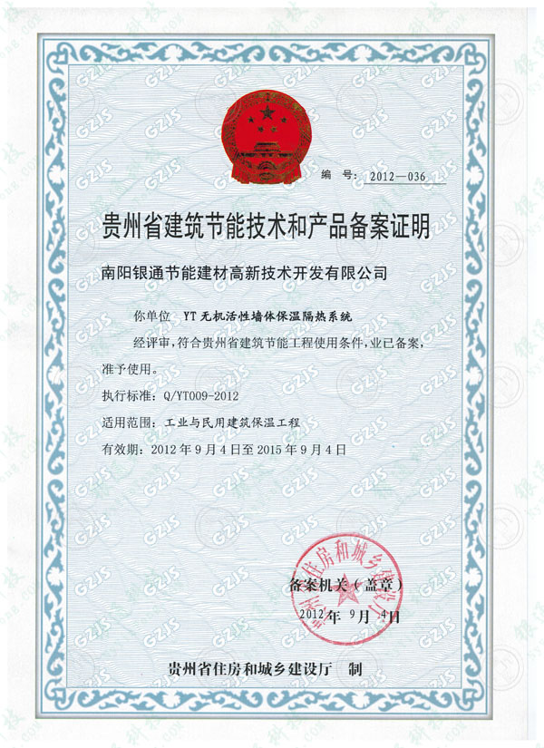貴州省建筑節(jié)能技術(shù)和產(chǎn)品備案證書 編號:2012—036 南陽銀通節(jié)能建材高新技術(shù)開發(fā)有限公司 你單位YT無機活性墻體保溫隔熱系統(tǒng) 經(jīng)評審,符合貴州省建筑節(jié)能工程使用條件,業(yè)已備案,準予使用。 執(zhí)行標準:Q/YT009-2012 適用范圍:工業(yè)與民用建筑保溫工程 有效期:2012年9月4日至2015年9月4日 備案機關(guān)(蓋章):貴州省住房和城鄉(xiāng)建設(shè)廳 2012年9月4日 貴州省住房和城鄉(xiāng)建設(shè)廳 制