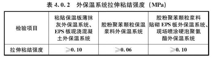 4.0.2 外保溫系統經耐候性試驗后,不得出現空鼓、剝落或脫落、開裂等的破壞,不得產生裂縫出現滲水;外保溫系統拉伸粘結強度應符合表4.0.2的規定,且破壞部位應位于保溫層內。