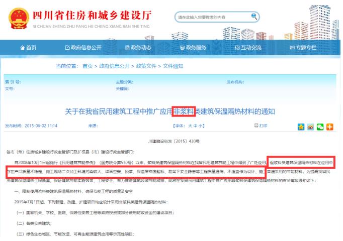 四川省住建廳在2020年6月發布的關于發布建筑保溫材料推廣、限制和禁止產品目錄的公告中限制使用類產品中明確限制范圍:不得用于國家機關、學校、醫院、保障性安居工程等政府投資或部分使用財政資金的建設項目;各類公共建筑;綠色生態城區、節能改造、可再生能源建筑應用等示范性項目;建筑地上總層數超過6層(含6層)的建設項目;以上項目中不得用于外墻、屋面、樓地面作為主要保溫隔熱材料使用。