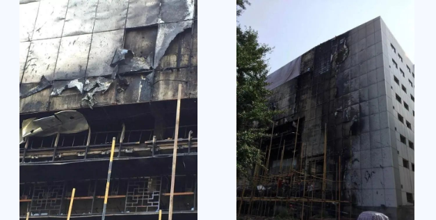比如2018年2月1日鄭州綠地原盛國(guó)際辦公樓分別發(fā)生鋁塑板幕墻著火,3號(hào)樓的南側(cè)半面、整個(gè)東側(cè)被燒的一塌糊涂,北側(cè)也有部分過(guò)火。火舌所到之處,30mm厚的擠塑板與鋁塑板一同化為烏有。
