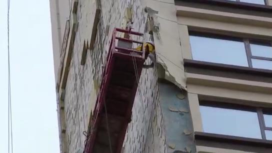 記者看到,現(xiàn)場已經(jīng)有工人開始對外墻保溫層進行了維修。 高達30多層樓的外墻, 從14層到23層, 大約有27米。27米 的保溫層外立面大面積脫落,已經(jīng)露出了混凝土,那這保溫層好好的 怎么 就掉了呢?
