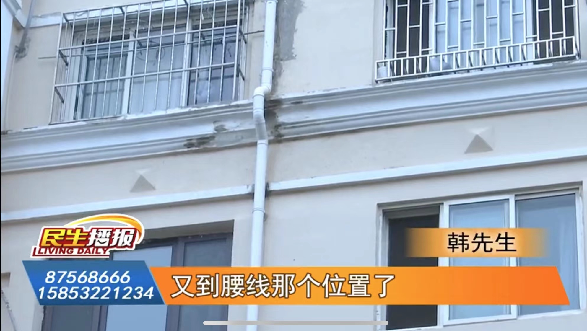 韓先生:有個落水管有個漏斗,雨下得大的時候,做保溫加厚了一層,漏斗可能讓保溫板頂著,跟落水管結合得不是太嚴密了,所以下大雨的時候淌不及,雨順著管道下來,順著管道下來后,又到腰線那個位置,到腰線位置后,順著腰線滲到墻里面了,存水了,這個腰線里面是空心的,然后水就進到屋里了。