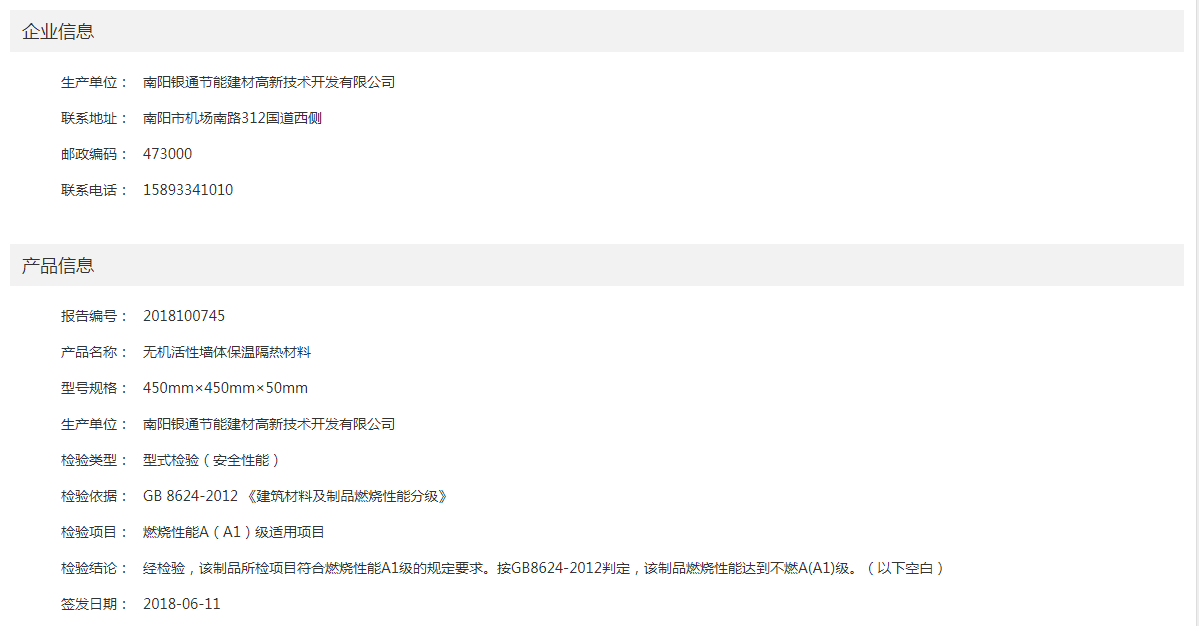 答:國家防火建筑材料質(zhì)量檢驗監(jiān)督中心(網(wǎng)址:http://www.fire-testing.net/)→報告及證書查詢→報告查詢→生產(chǎn)企業(yè)(輸入:南陽銀通)